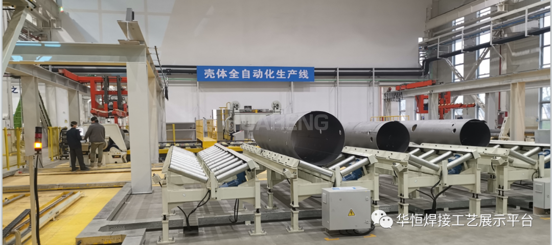 整个生产历程从辊道运送板材自动收支抛丸室和洗濯防锈室再运送至卷板机举行自动卷制筒体,,,,,,,卷制后的筒体使用行爪送至RGV小车,,,,,,,RGV小车凭证现实生产送至纵缝焊机举行焊接,,,,,,,焊接完成后的筒体使用AGV小车最终送至探伤室举行探伤磨练,,,,,,,并且整个生产历程可通过中控实时掌握生产信息。。。。。。。。